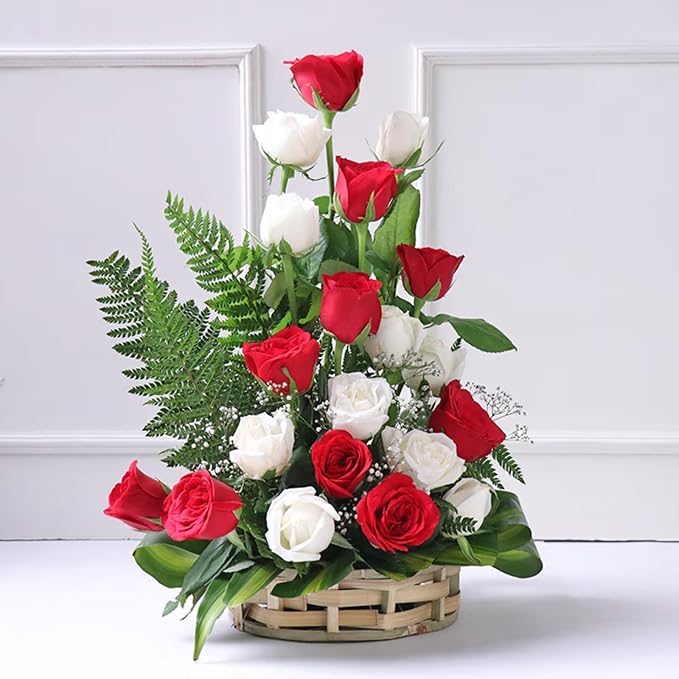 FlowerAura Fresh Live Flower Bouquet of 20 White & Red Roses Flowers In Basket For Birthday Gift, Anniversary Gift, Wedding Gift, Congratulations Gift & Gift For Special Occasions (Same Day Delivery)