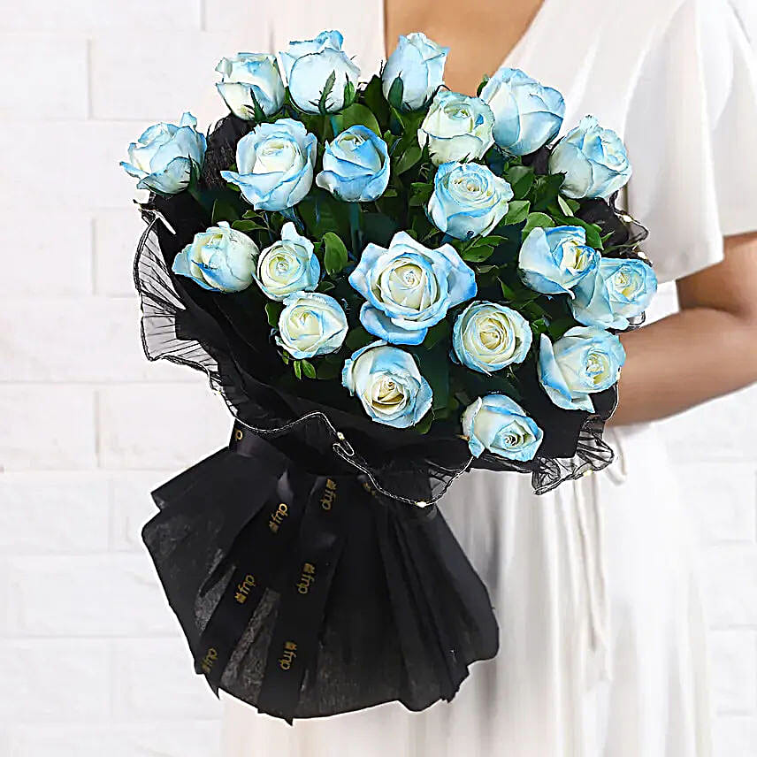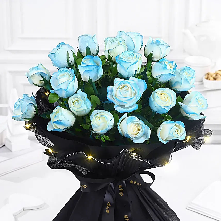Brighten any celebration with this exquisite bouquet of white roses, hand-sprayed to a tranquil blue. Each rose symbolises purity and new beginnings, making it a meaningful gift for any special occasion. Wrapped in a sleek black sheet adorned with enchanting LED lights that cast a mesmerising glow. Perfect for anyone who cherishes elegance and modern charm, this bouquet is a dazzling way to celebrate and make a memorable impression.